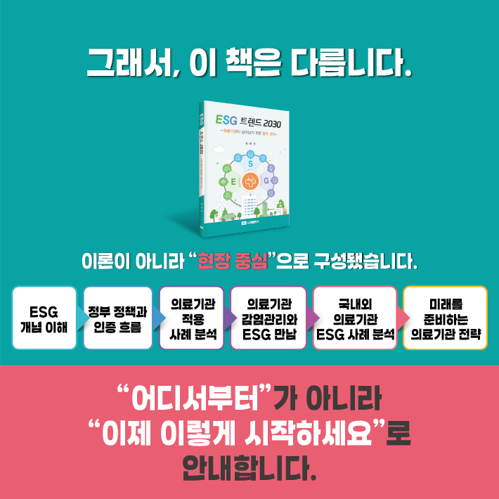 ESG 트렌드 2030 | 의료는 더 이상 병을 고치는 데에만 머물 수 없다. 병원을 신뢰하는 사회, 환자를 존중하는 환경, 지속 가능한 삶을 위한 균형의 철학이 이제 경영의 언어가 되었다. 왜 지금, ESG