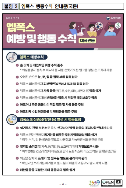 7. 엠폭스 발생국가 방문력이나 의심환자 밀접접촉 등의 위험요인과 의심증상이 있는 경우 질병관리청 콜센터(1339)로 상담해 줄 것을 당부