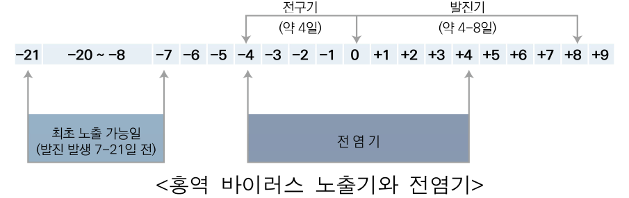* 홍역은 발진이 나타나고 4일까지 호흡기 격리가 필요한 질병으로, 홍역 의심환자가 유치원, 학교, 학원 등 단체시설에서 발생한 경우 발견 즉시부터 발진 발생 후 4일까지 등교 중지가 권장됩니다.