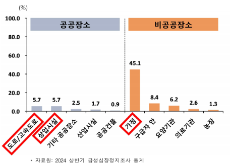 전체 환자의 64%가 가정이나 요양기관 등 비공공장소에서 발생하고 있으며, 특히 가정 내 발생이 45.1%에 달합니다.