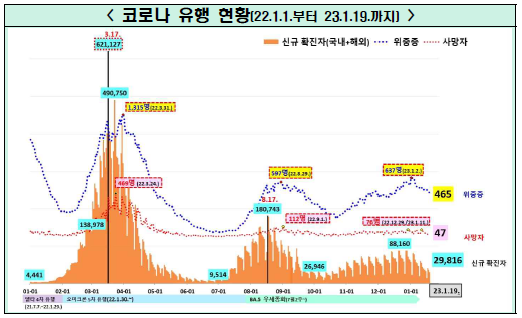 6. 2023년 1월 19일 자 기준으로 일일 신규 확진자 수는 지난 8주간 최저 수치인 29,816명을 기록하여 동절기 유행은 점차 감소 추세이다.