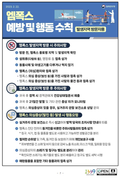 7. 엠폭스 발생국가 방문력이나 의심환자 밀접접촉 등의 위험요인과 의심증상이 있는 경우 질병관리청 콜센터(1339)로 상담해 줄 것을 당부