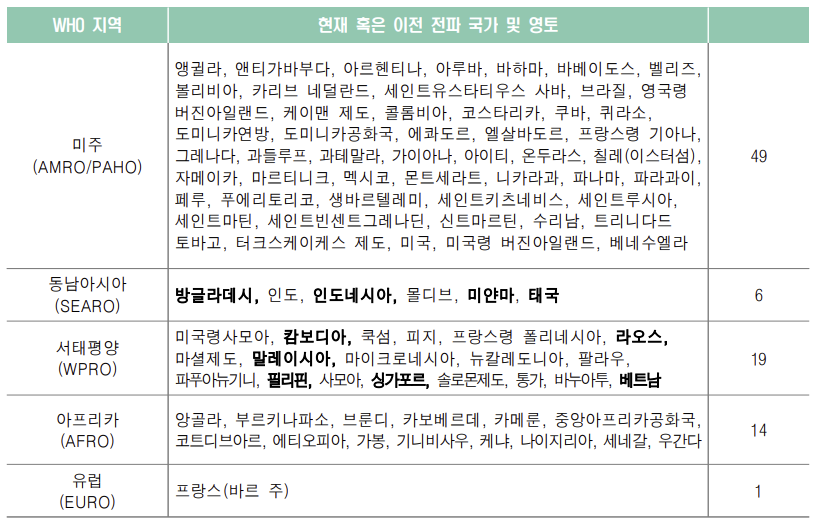 1. 1951년~1981년에 걸쳐 지카바이러스의 인간 감염 증거가 중앙아프리카 공화국, 이집트, 가봉, 시에라리온, 탄자니아, 우간다와 같은 다른 아프리카 국가뿐만 아니라 인도, 인도네시아, 말레이시아, 필리핀, 베트남, 타이와 같은 아시아 일부에서도 보고되었다.