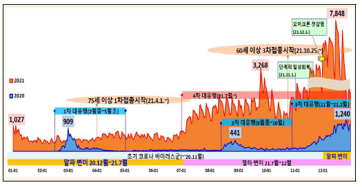 5. 전파력이 높은 오미크론 변이 출현, 방역조치 완화, 2차 접종의 효과 감소로 2021121일부터 확진자가 급증하여 일상회복을 잠시 멈추게 되었다.