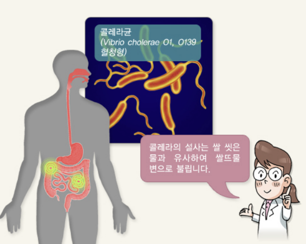 2. 병원체: Vibrio cholerae O1 또는 V. cholerae O139로 Vibrionaceae과에 속하는 그람 음성 막대균이다. 콜레라 독소(cholera toxin)가 분비되어 설사 유발