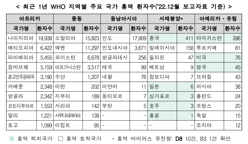 세계보건기구(WHO)12월 기준으로 취합한 최근 1년 현황을 보면 인도 1 7909명, 나이지리아 1만 9938명, 소말리아 1만 5823명 등 아프리카 10개국을 비롯해 동남아시아 8개국, 중동 10개국, 아메리카·유럽 10개국, 서태평양 9개국 등 총 47개국에서 환자가 발생했다.
