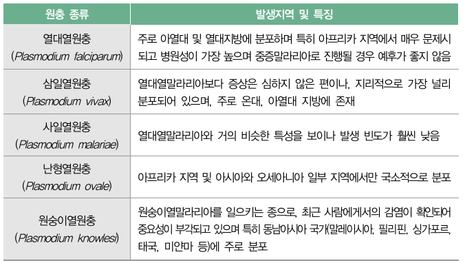 - 해외에서 감염될 수 있는 말라리아는 병원성이 높은 열대열 말라리아로, 중증 진행 위험이 크고 합병증 및 치사율도 높아 신속한 진단 및 치료가 매우 중요