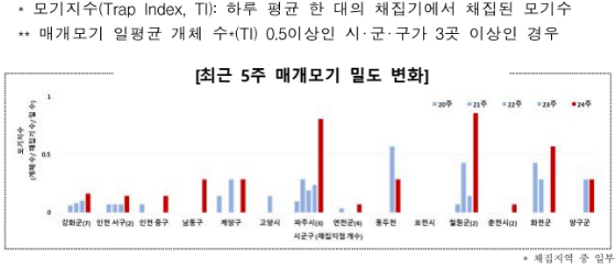 이번 주의보 발령은 24주차(6월 8일~14일) 매개모기 감시 결과를 바탕으로 한 것으로, 철원군(0.9), 파주시(0.8), 화천군(0.6) 등 3곳에서 일일 평균 모기지수가 0.5 이상을 기록하면서 발령 기준을 충족했습니다.